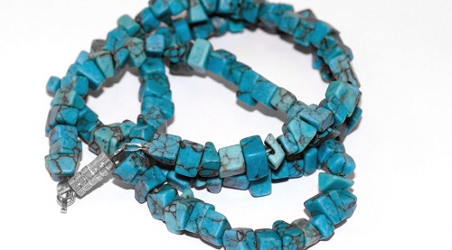 綠松石因“形似松球,色近松綠”而得名,顏色有深有淺,質(zhì)地不均,致密程度也有較大差別,它作為佩戴和使用已有5000年以上的歷史。綠松石的產(chǎn)地很多,以湖北鄖縣、鄖西、竹山一帶的優(yōu)質(zhì)綠松石世界著名,其中鄖西的鄖西菜籽黃最具特色,玉石中含鋅,全世界只有中國湖北和美國內(nèi)華達州有產(chǎn)出。