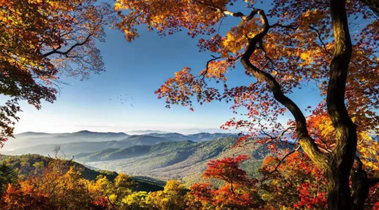秋季的光霧山,秋色蓬勃,紅葉似火,五彩斑斕的色塊在風(fēng)中潮水般洶涌起伏,渾然成了色彩海洋。山山嶺嶺的紅葉,以難得的本樸和自然,素面朝天。如火如荼的紅葉掛滿枝頭,萬葉飄丹的美景出現(xiàn)在秋風(fēng)吹過的林海,成千上萬的紅葉隨風(fēng)飄飛,像是翩翩起舞的精靈。
