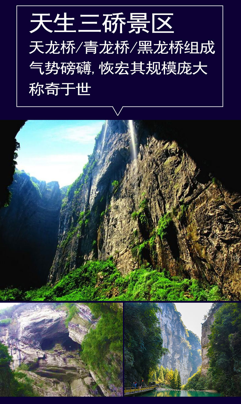 后前往游覽世界地質(zhì)奇觀 【 天生三橋】 景區(qū)(游覽約 2 小時左右,統(tǒng)一換乘景區(qū)交通車 40 元/人費用已含)《變形金剛 4》、《黃金甲》、《爸爸去哪兒》拍攝地、國家 AAAAA 級風景名勝區(qū),以其壯麗而獨特的“三硚夾兩坑”景觀稱奇于世。世界最大天生橋群和世界第二大天坑群相映生輝,坑與坑之間以橋洞相望,橋與橋之間以坑相連,規(guī)模宏大,氣勢磅礴,瑰麗壯觀。是張藝謀 06 年電影大片《滿城盡帶黃金甲》唯一外景地。如親臨拍攝地、觀看投資 200 萬修建的唐朝古驛。